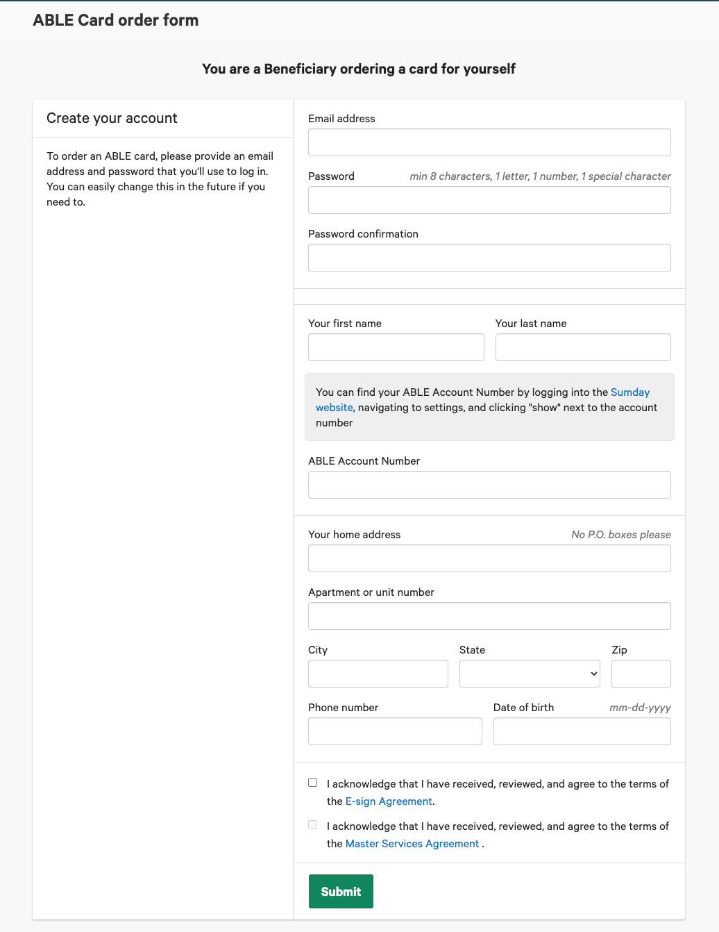 If you manage the account for a beneficiary who is not you, you will have the option to order a card for yourself to make purchases on behalf of the beneficiary, a card for the beneficiary, or cards for both of you. If you are a beneficiary managing your own account, you will just order a card for yourself.