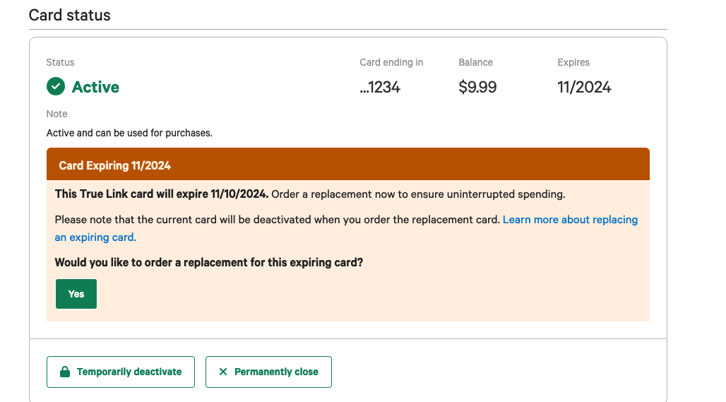 If you no longer need the card, select the option to permanently close the card below the expiring card message. This action will close the account permanently and provide options for returning any remaining card balance.